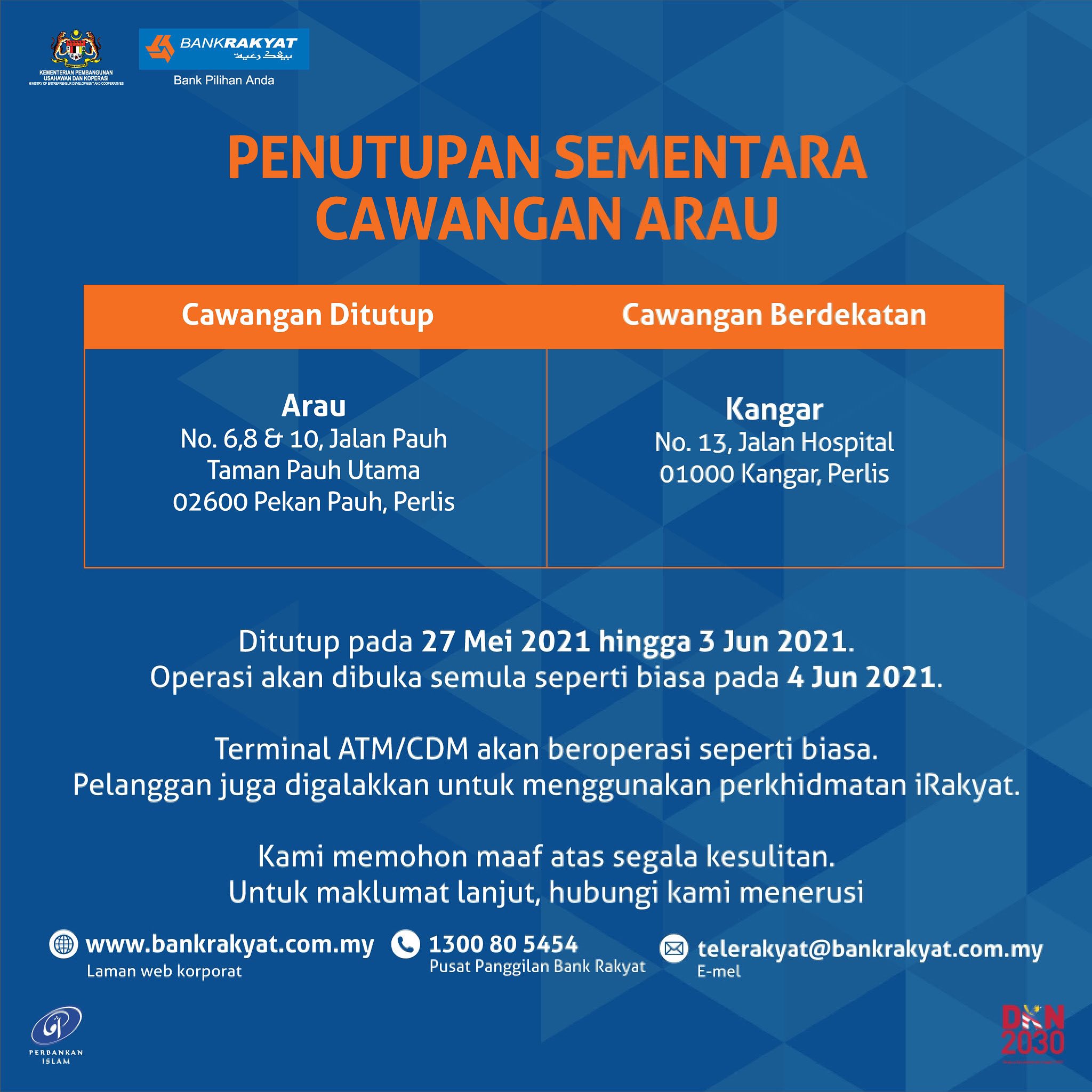 تويتر Bank Rakyat على تويتر Pelanggan Yang Dihargai Sila Ambil Maklum Berkaitan Penutupan Sementara Cawangan Arau Pada 27 Mei 2021 Hingga 3 Jun 2021 Operasi Akan Dibuka Semula Pada 4 Jun